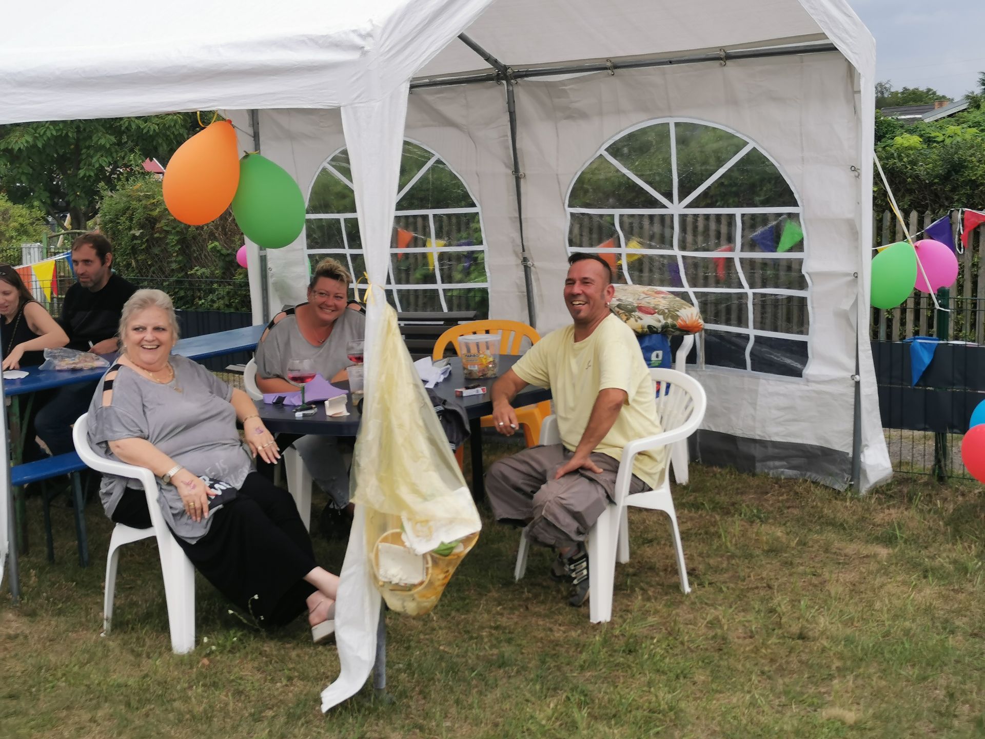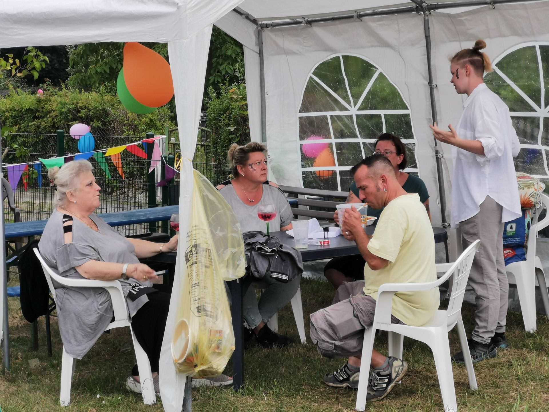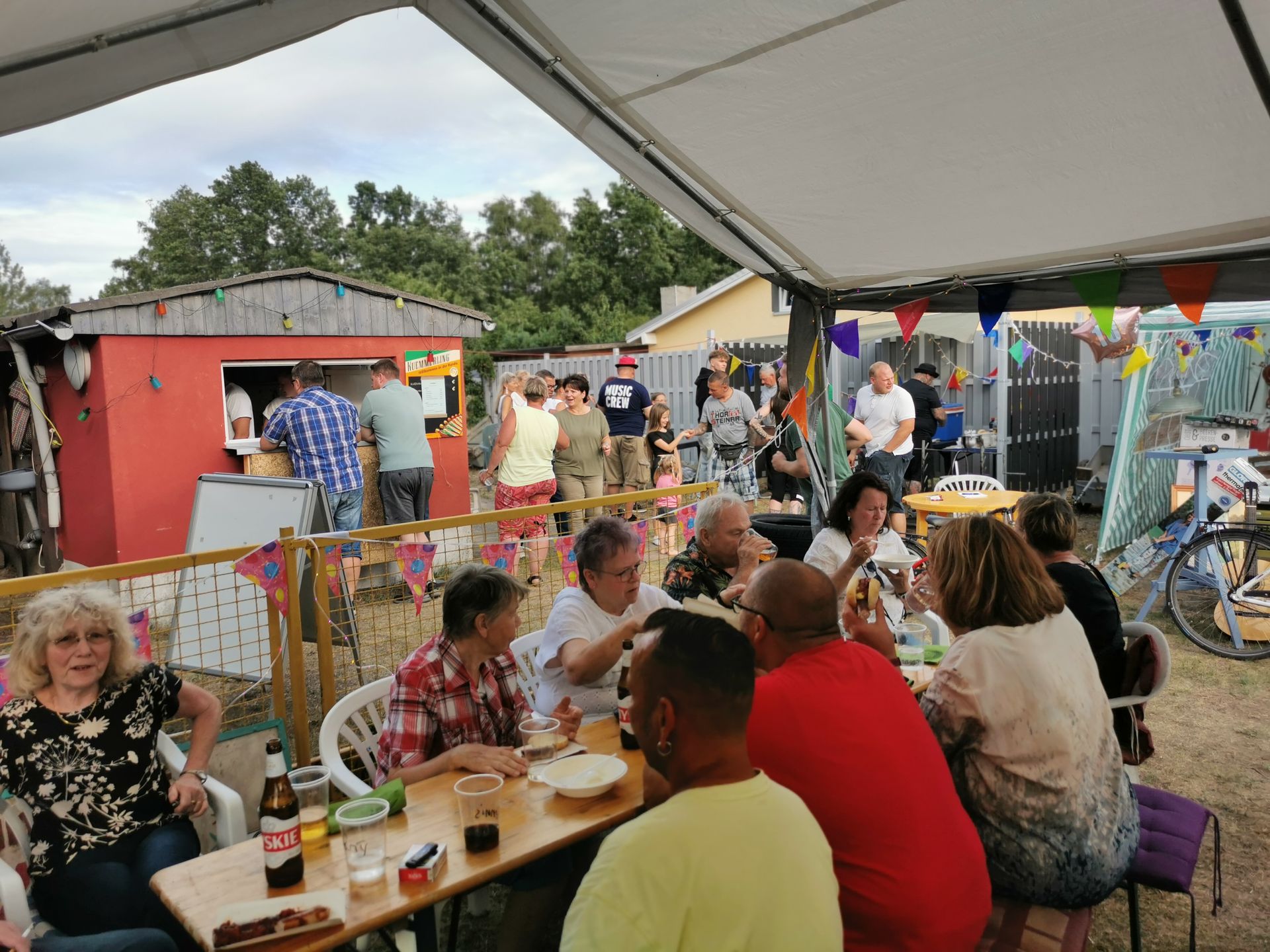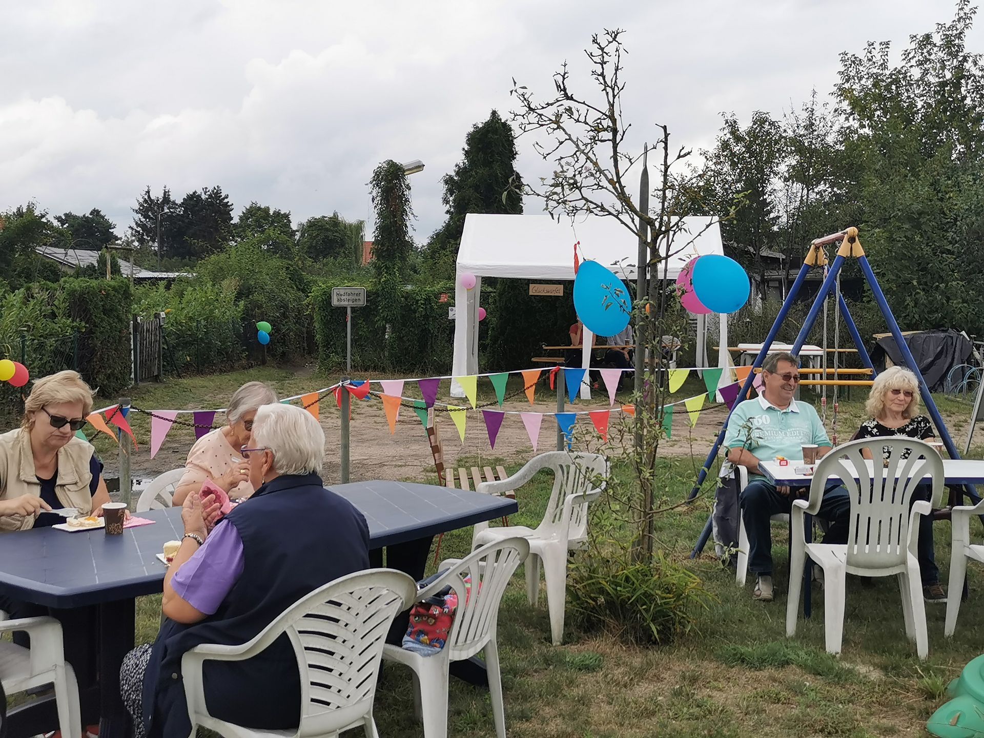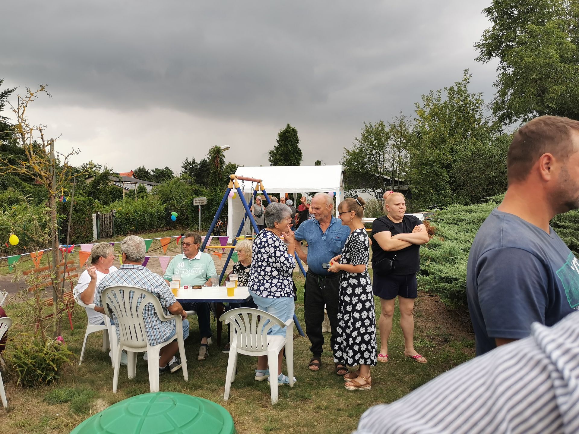 14 Uhr fing die Feier an, langsam füllten sich die Reihen. Die Musikalische Darbietung von Peter Hengge war ein Ohrenschmaus. Hier wurden alle Gäste mehr als abgeholt. Zusätzlich war eine Fotobox vorhanden, bei welcher sich alle Gäste für einen schmalen Taler allein oder auch in Gruppen, in Szene setzen konnten. Das Wetter war zwar bewölkt und schwül, aber bis zum späten Nachmittag gab es keinen Regen. So konnte auch die Softeismaschine ihre Dienste tun. Auch die Brandenburger Kleiderursel war anwesend und hatte tolle Waren im Gepäck, welche im Zusammenspiel mit einem kleinen Flohmarkt viele Leute ansprachen. Natürlich gab es auch die allbekannten Highlights, wie ein riesiges Kuchen Büfett, mit einem -100 Jahre Gartensparte Zukunft- Kuchen, eine Hüpfeburg und Kinderschminken, Kegeln mit Preisverleihung und Forellenwürfeln waren ebenfalls, zwar wie im Vorjahr, aber doch etwas üppiger, vorhanden. Beim Würfeln gab es dieses Mal auch noch geräucherten Käse, welcher ein wahrer Gaumenschmaus gewesen ist. Selbstverständlich gab es auch wieder leckeres Essen, wie Soljanka und Bratwurst, welche Krampe und Team mit seinen Kochkünsten zauberte. Und wie in jedem Jahr hat der Kneiper vom Appelboom, Uwe, alles getan, damit niemand auf dem Trockenen steht. Es war also ein wirklich gelungenes Fest, alle anwesenden hatten Spaß und kamen auf Ihre Kosten. In diesem Sinne auch noch einmal ein großes Dankeschön an die Organisatoren des Festkomitees und allen fleißigen Helfern.